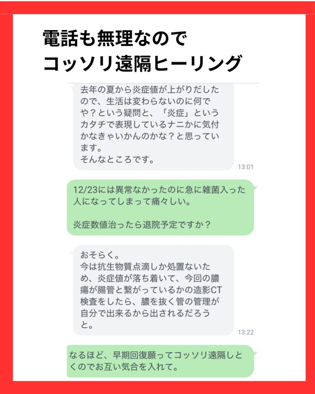 「遠隔希望」とメッセージをお送りください。 あなたの体の状態を伺った上で、スケジュールを調整します。